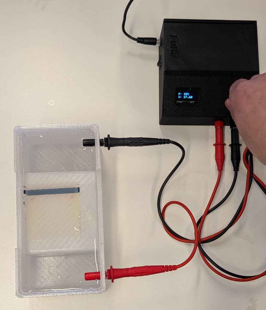 - The separation of the amplified DNA by electrophoresis in a chamber and open source power supply that can be built locally (here).
