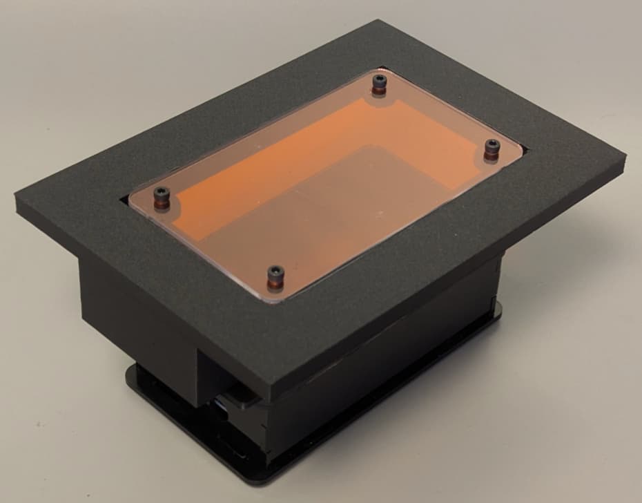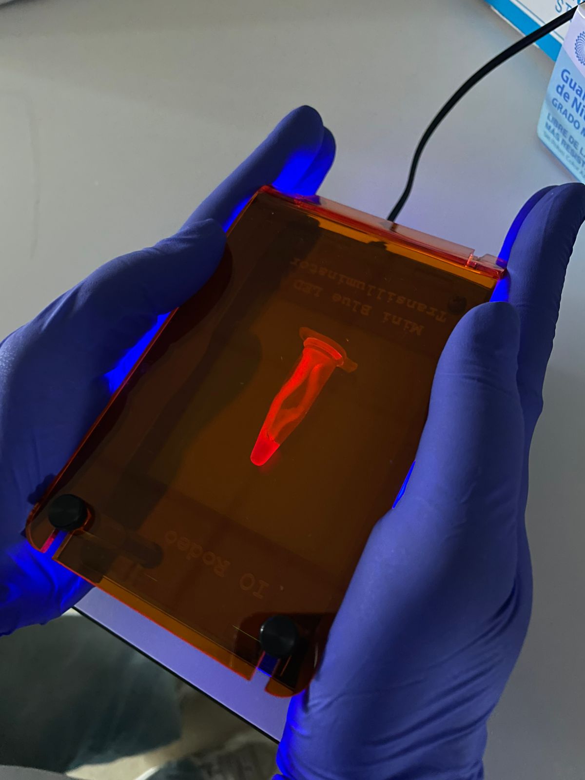 - The visualization of results with an open transilluminator, which can be built locally in Chile/Argentina without depending on imported acrylics and LEDs. A nice collaboration with Jo from IORodeo here. We have worked with Fran Quero to adapt the IOrodeo transilluminator to be more fabricable in Chile/Argentina. First, we changed the superbrightleds (details in the repo and docs linked in readme) that are very nice but expensive and need to be soldered by hand, one by one. Fran designed a new PCB with SMD blue LEDs that work very well and you can order them already mounted in the PCB (we tried many different options, see the repo if interested). Next, we replaced the acrylic filters with leefilters (used in the GMOdetective project). With all these changes, the device works really nice but at a fraction of the original cost. We also add a usb-c alternative power supply because jack barrels are sometimes mixed up in a lab (e.g. 12,V, 15V, etc) and it is easy to burn things.